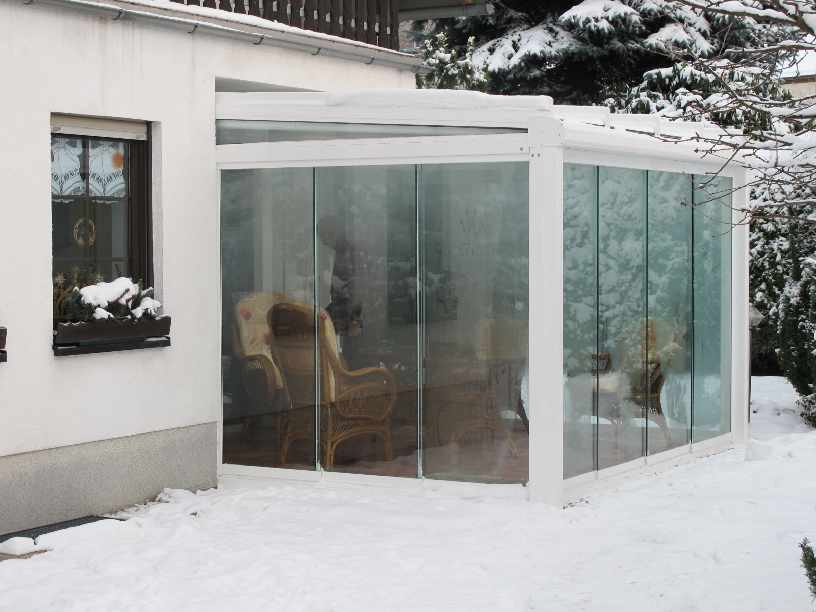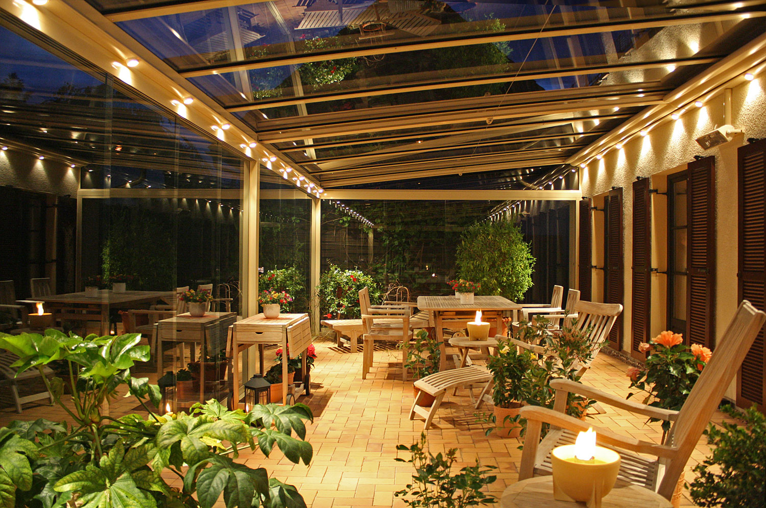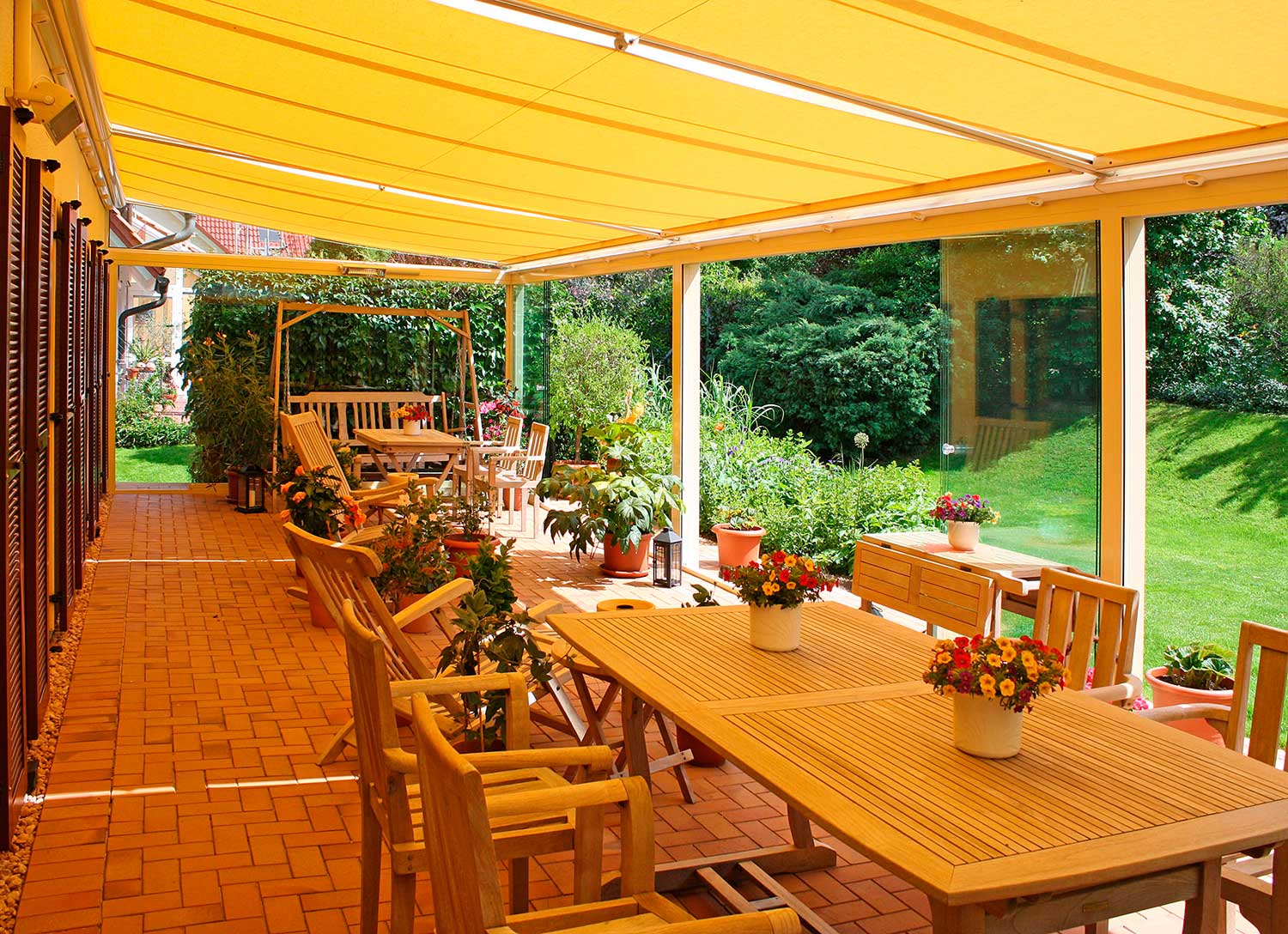 Terrassendach mit Seitenverglasung und Sonnenschutz